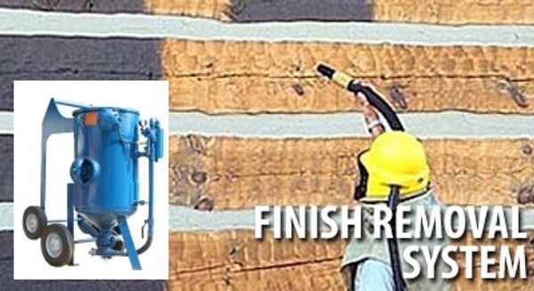 After blasting, we hand sand, log wash, and apply three coats of Permachink systems stain. We use Permachink Ultra 7 five-year warranty stain.